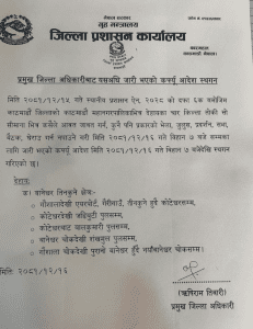 यता, स्थानीय प्रशासन ऐन, २०२८ को दफा ६ बमोजिम काठमाडौंको बानेश्वर तीनकुने क्षेत्र, गौशालादेखि एयरपोर्ट, गैरीगाउँ, तीनकुने हुँदै कोटेश्वर, कोटेश्वरदेखि जडीबुटी पुल, कोटेश्वरबाट बालकुमारी पुलसम्म, बानेश्वर चोकदेखि शंखमूल पुलसम्म र गौशाला चोकदेखि पुरानो बानेश्वर हुँदै नयाँबानेश्वर चोकसम्म लगाइएको कर्फ्यु स्थगन गरिएको प्रशासन कार्यालयले एक सूचनामार्फत जानकारी दिएको अवस्था छ ।