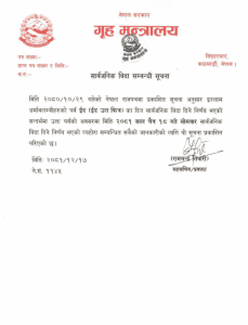 आइतबार बिदा सम्बन्धि विज्ञप्ती जारी गर्दै गृह मन्त्रालयले (इद उल फित्र) को अवसरमा चैत १८ गते सोमबार बिदा दिने निर्णय पक्का गरेको मन्त्रालयका सह-सचिव तथा प्रवक्ता रामचन्द्र तिवारीले जनाएका छन् ।