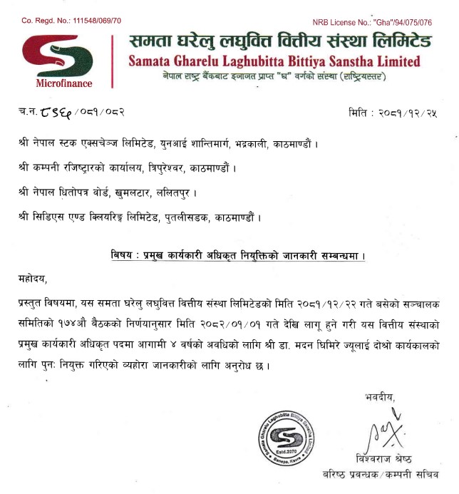 काठमाडौं । समता घरेलु लघुवित्त वित्तीय संस्था लिमिटेडको प्रमुख कार्यकारी अधिकृतमा (सिइओ) मा डा. मदन घिमिरेलाई पुनः नियुक्त गरेको छ ।