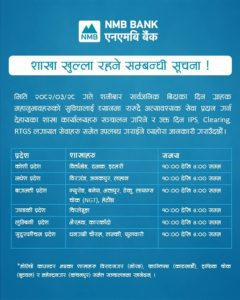 भोली सार्वजनिक बिदाको दिन शनिबार पनि एनएमबी बैंकले केही शाखा खोल्ने बीमा दर्पण असार २७, २०८२ काठमाडौं । एनएमबी बैंकले सार्वजनिक बिदा परे पनि भोलि शनिबार आफ्ना केही शाखाहरु खुल्ला रहने जनाएको छ । बैंकले एक सूचना जारी गर्दै आफन ग्राहकहरुलाई सो जानकारी प्रदान गरेको हो ।यस्तो छ सूचना Author बीमा दर्पण View all posts