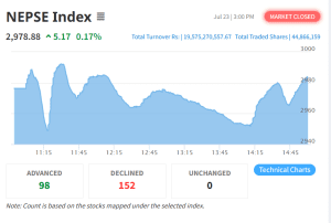 नेपाल स्टक एक्कचेञ्ज (नेप्से) ५.१७ अंंकले बढेर २९७८.८८ बिन्दुमा कायम भएको छ । आज ३१९ कम्पनीको ४ करोड ४८ लाख ६६ हजार कित्ता शेयर किनबेच हुँदा १९ अर्ब ५७ करोड ५२ लाख ७० हजार रुपैयाँको कारोबार भएको छ ।