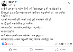 बालेनले हाले स्टयाटस, भने जेनजी अब संयमित हुनुहोला बीमा दर्पण भदौ २४, २०८२ काठमाडौं । काठमाडौं महानगरपालिका मेयर बालेन शाहले जेनजीलाई अब संयमित हुन अपिल गरेका छन् । उनले प्रधानमन्त्रीको राजिनामासँगै सामाजिक संजालमार्फत तस्तो अपिल गरेका हुन् । Author बीमा दर्पण View all posts