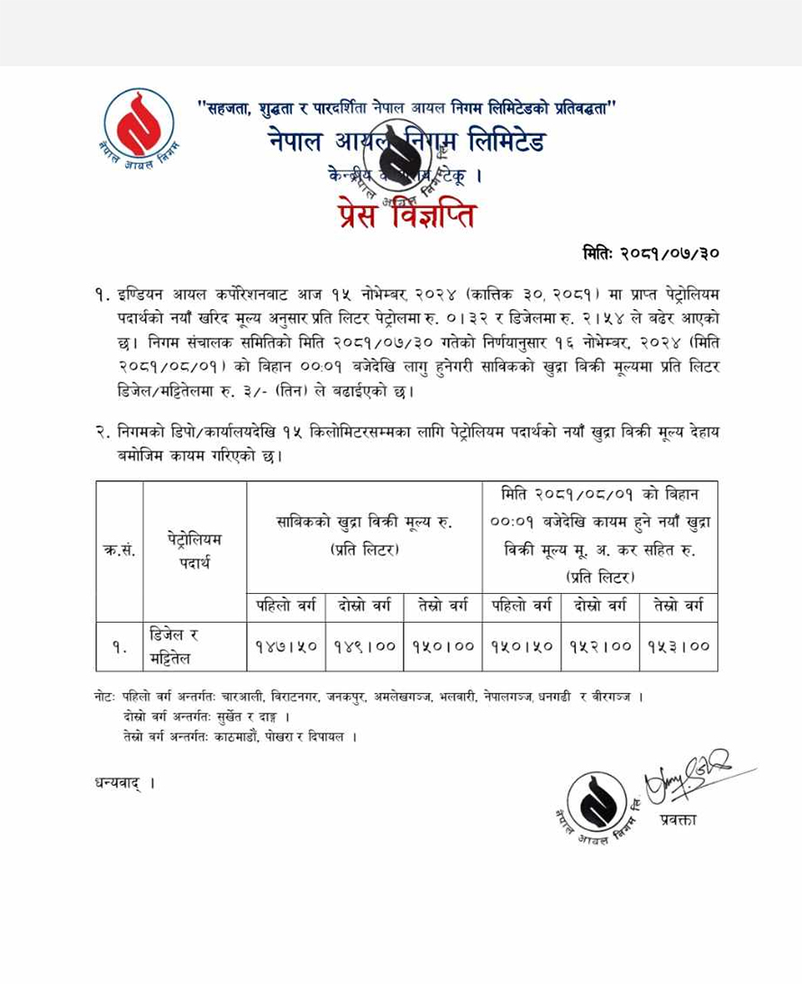 यस्तै सुर्खेत र दाङमा डिजेल र मट्टितेलको मूल्य प्रतिलिटर १५२ रुपैयाँ कायम भएको छ भने काठमाडौं, पोखरा र दिपायलमा डिजेल र मट्टितेलको मूल्य प्रतिलिटर १५३ कायम भएको छ । तर, पेट्रोलको मुल्य भने बढाइएको छैन ।