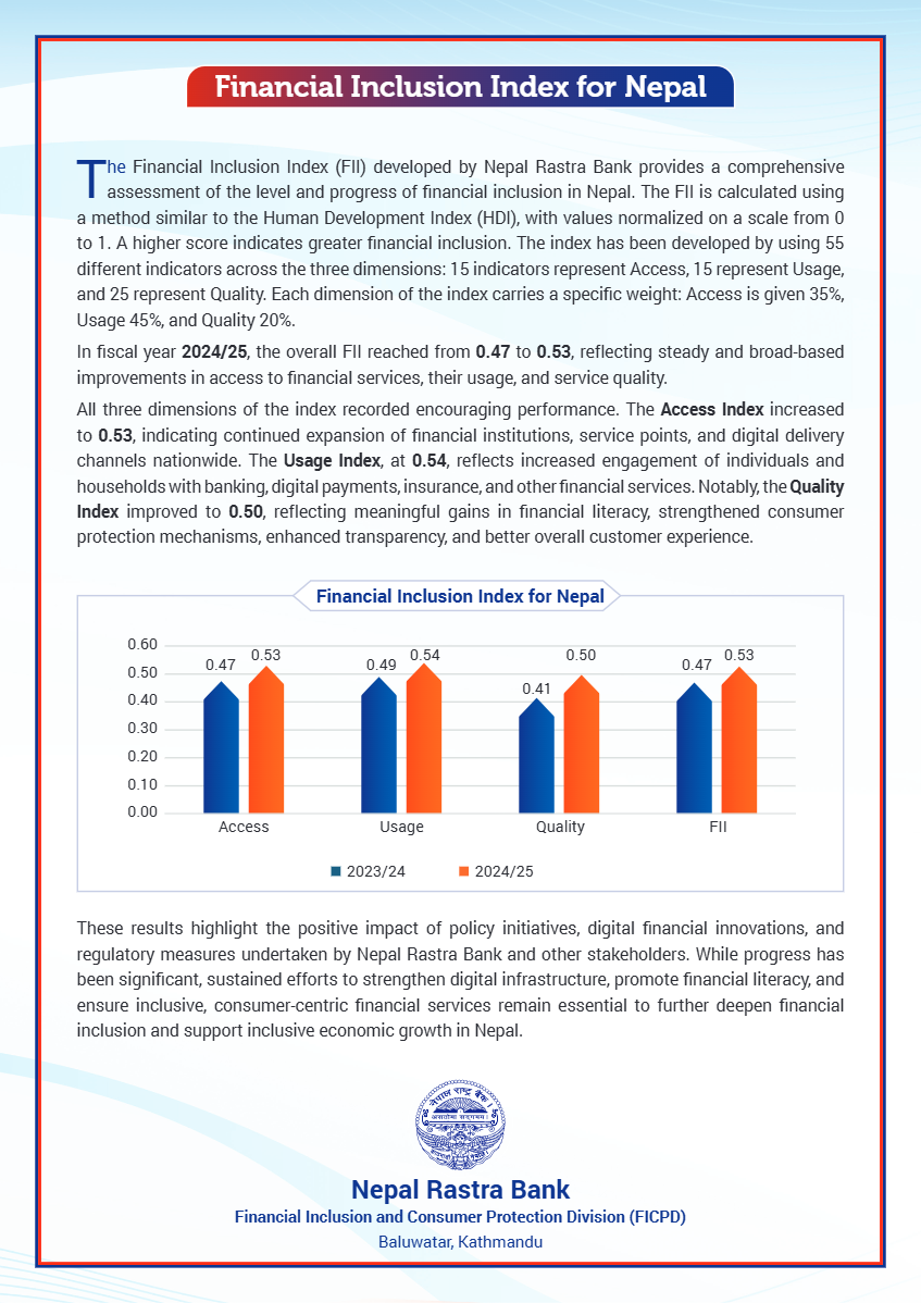 आर्थिक वर्ष २०८१/८२ मा नेपालको वित्तीय समावेशन सूचकांक ०.५३ मा पुगेको छ, जुन गत वर्ष ०.४७ मा सीमित थियो । सूचकांकका तीनवटै आधारभूत आयाममा सकारात्मक परिवर्तन देखिएको छ । वित्तीय पहुँचतर्फ हेर्दा सूचकांक ०.५३ पुगेको छ, जसले देशभर बैंक तथा वित्तीय संस्था, शाखा, सेवा केन्द्र र डिजिटल वित्तीय माध्यमहरूको दायरा बढ्दै गएको छ ।
