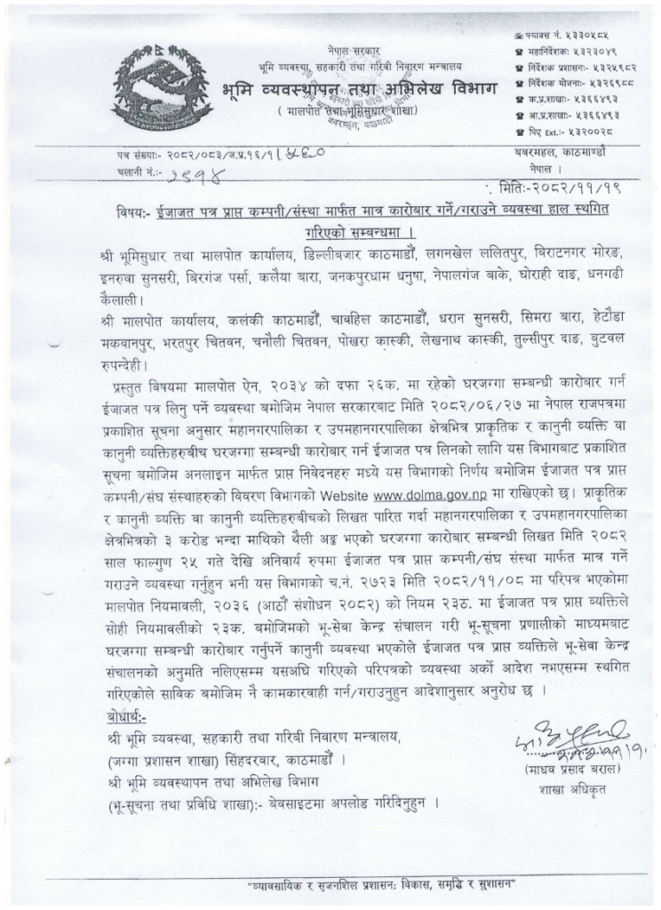 विभागले फागुन १९ गते जारी गरेको सूचनामार्फत यसअघि फागुन ८ गते गरिएको परिपत्र हालका लागि कार्यान्वयन नगर्न भनिएको छ। सो परिपत्रअनुसार महानगर र उपमहानगरपालिकाभित्र तीन करोडभन्दा माथिको थैली अंक भएका घरजग्गा कारोबार इजाजतप्राप्त कम्पनीमार्फत मात्र गर्नुपर्ने व्यवस्था गरिएको थियो। उक्त प्रावधान फागुन २५ गतेदेखि लागू गर्ने तयारी थियो।