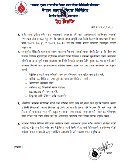 निगमले कसैले अनावश्यक रूपमा ग्यास सिलिन्डर होल्डिङ (भण्डारण) गरेको पाइएमा, बढी मूल्य लिई ग्यास तथा पेट्रोलियम पदार्थ बिक्री गरेमा, नयाँ सिलिन्डरको बजारीकरण गरेको पाइएमा कानुनबमोजिम कारबाहीको चेतावनी पनि दिएको छ।