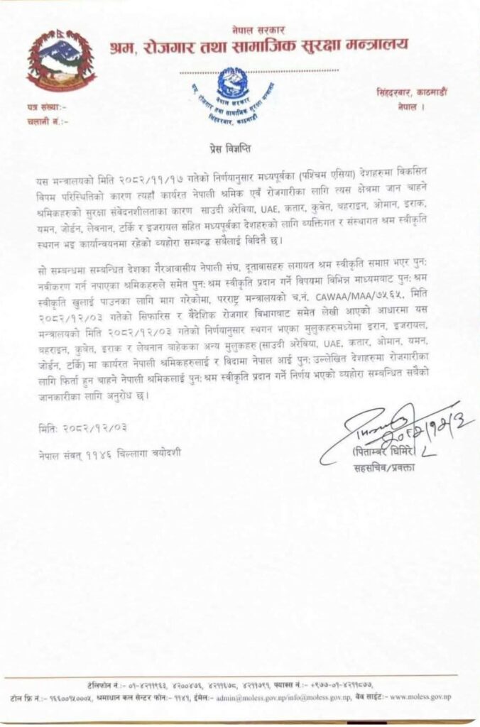 पछिल्लो निर्णयमा भने इरान, इजरायल, कुवेत, बहराइन, इराक र लेबनानका लागि पुनः श्रम स्वीकृति अझै खुला नगरिएको स्पष्ट गरिएको छ। ती देशहरूमा सुरक्षा तथा परिस्थितिजन्य संवेदनशीलता कायम रहेको जनाइएको छ।