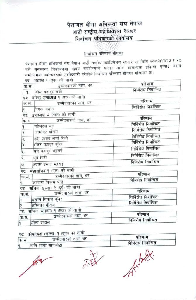 पेशागत बीमा अभिकर्ता संघको नयाँ कार्यसमिति निर्विरोध निर्वाचित, अध्यक्षमा खत्री