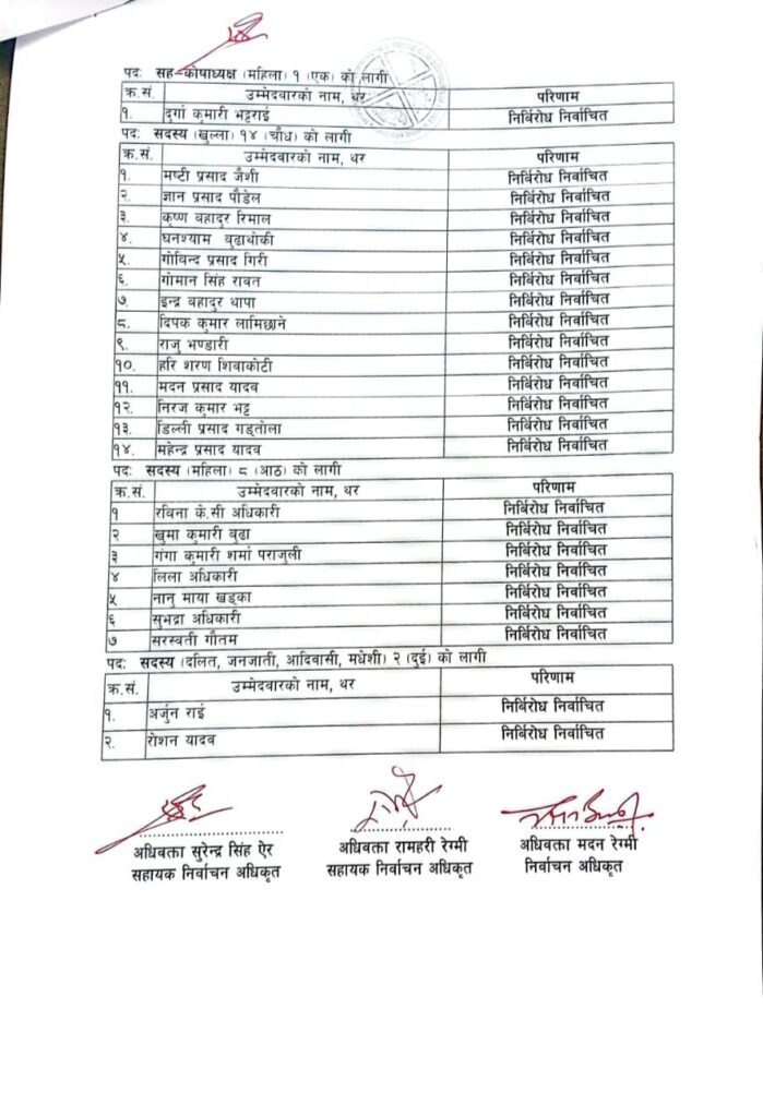 सदस्य (महिला) तर्फ रविना केसी अधिकारी, खुमा कुमारी बुढा, गंगा कुमारी शर्मा पराजुली, लिला अधिकारी, नान माया खड्का, सुभद्रा अधिकारी र सरस्वती गौतम निर्विरोध निर्वाचित भएका छन्। यस्तै सदस्य (दलित, जनजाति, आदिवासी, मधेसी) तर्फ अर्जुन राई र रोशन यादव निर्विरोध निर्वाचित भएका छन्।