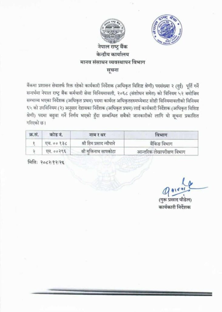 न्यौपाने र सापकोटा यसअघि निर्देशक (अधिकृत प्रथम श्रेणी) पदमा कार्यरत थिए । अनुभव तथा कार्यसम्पादनका आधारमा कार्यकारी निर्देशक पदमा बढुवा गरिएको राष्ट्र बैंकले जनाएको छ ।