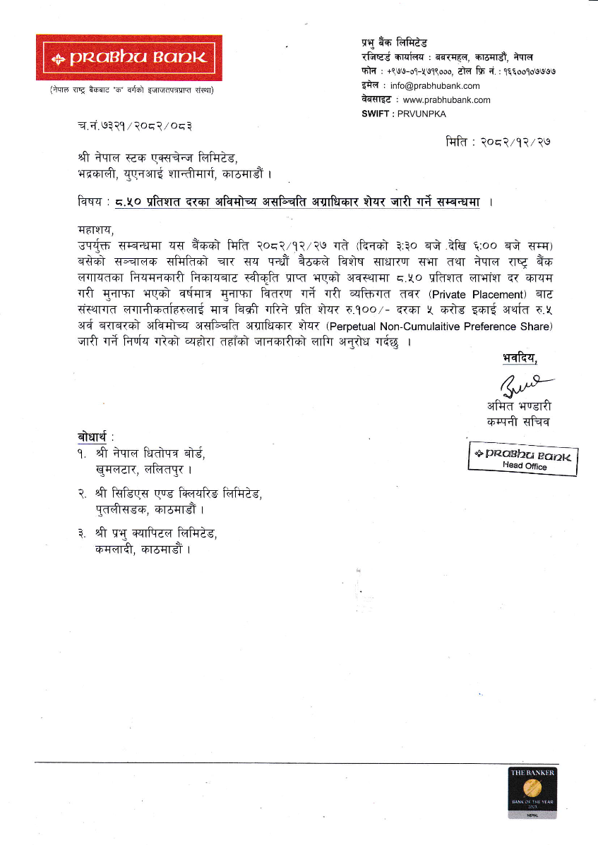 प्रभु बैंकले अविमोच्य असञ्चिति अग्राधिकार सेयर जारी गर्ने